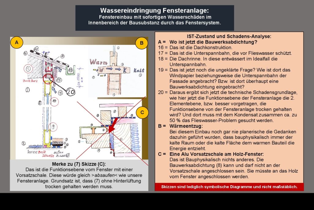 Das erste, was von einem Leckorder oder auch Schadenssanierer vorgenommen werden muss ist, wie das jeder Sachverständige macht, eine Schadensanalyse zu erstellen. Das heißt, es muss erst einmal sichergestellt werden, woher der Schaden kommt. Denn wollen wir unsere Bausubstanz gesund halten, müssen wir erstrangig die Angriffssituation außer Kraft setzten. Das ist bei einem Wasserschaden, der aus einem gerissenen Siphon unterhalb des Spülschrankes ein Einfaches, da der Schaden aus dem Augenschein erkannt werden kann. Daher haben wie aus unseren Seminarfolien einen Fall gewählt, bei dem das Ganze nicht so einfach ist. Haben wir aber feuchte Stellen und Wassereindringungen, bei denen wir augenscheinlich nicht gleich die Ursache erkennen können, kommen Menschen wie bei Polygonvatro, die sich als sogenannte Leckorder ausgeben. Die Erfahrung zeigt, dass unsere Meinungen von den Sachverständigentagungen solche selbsternannten Berufsbezeichnungen als Apparatschi-Indianer bezeichnen. Da werden in der Regel von meist angelernten Menschen ohne Sachverstand enorme Bauteilöffnungen vorgenommen um die Leckage zu suchen. Dabei wird aus den Erfahrungen des Sachverständigen vom BauFachForum, Zerstörungen vorgenommen, die gänzlich am Sachverstand zweifeln lassen. Meist sind in Küchen, Bäder und Fluren die Fließen komplett herausgerissen und der Öffnungsschaden ist meist größer als der Wasserschaden selber. Daher der Begriff Apparatschi-Indianer diese sogenannten Leckorder sind ohne Schadensinstinkt und ohne Sach- und Fachkenntnissen. Sie kommen mit einem großen Lieferwagen auf die Baustelle und haben diesen vollgepackt mit Messgeräten, alle möglichen technischen Instrumente und Messen Feuchtigkeit und was auch schon vorkam, der Gestank der in einer Bauhülle herrscht. Ja, natürlich kann ein Sachverständiger Gestank messen. Allerdings ist das hochkarätige Messinstrument in der Regel nicht ein technisches Gerät, sondern die menschliche Nase!