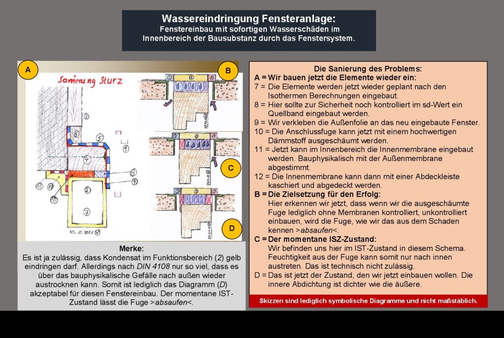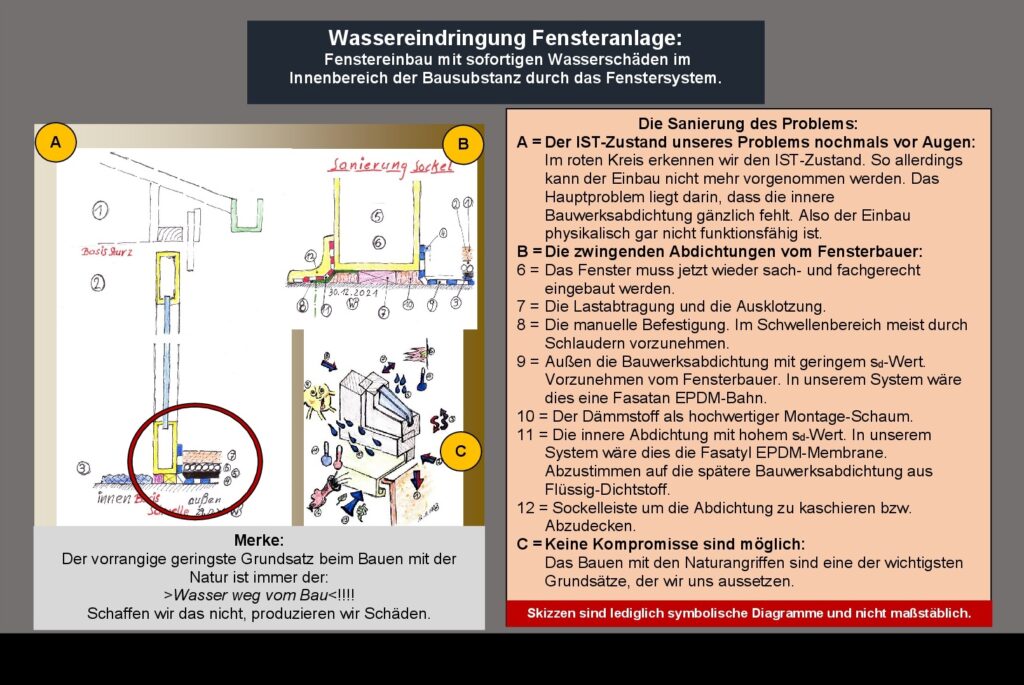 Und das ist ein kompletter Irrtum. Die Versicherungsverträge geben deutlich vor, dass der Schaden so instandgesetzt werden muss, dass der IST-Zustand nach der Sanierung dem SOLL-Zustand vor dem Schaden entsprechen muss. Und dazu gehört nicht als Erstmaßnahme, dass Kondensattrockner eingesetzt werden müssen. Sondern, dass erstrangig der Wassereintritt gestoppt wird.